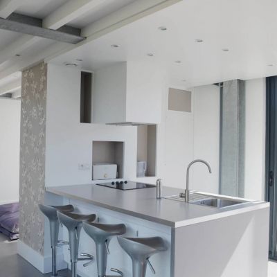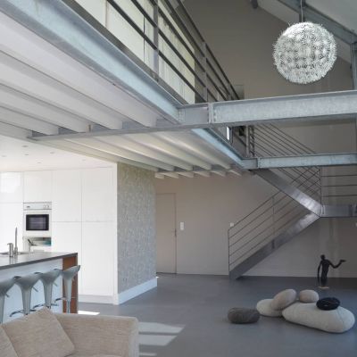 Conçue comme une grange avec la différentiation de la structure et de l’enveloppe, la maison possède une grande ouverture d’espace. Seules quelques parois coulissantes, modulent les pièces.