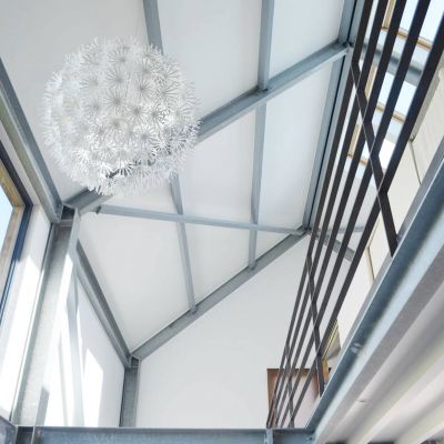 Cette grande ouverture tant en plan qu’en coupe permet au soleil de traverser tous les espaces : lumière zénithale et ouverture des pièces côté sud illuminent le séjour au nord vers le paysage.