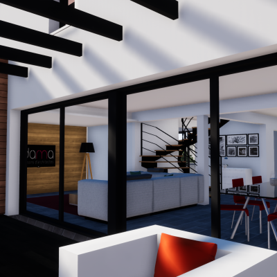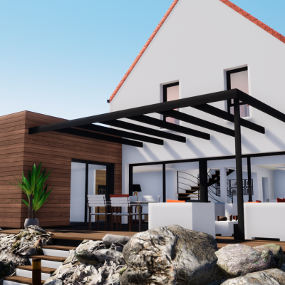 Une terrasse plein sud vient compléter l’organisation de la maison permettant un accès depuis le séjour et la chambre, le tout sous une pergolas permettant de délimiter ces espaces.