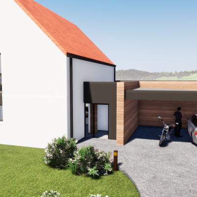 Situé dans un lotissement à Bazinghen sur la Terre des 2 Caps, cette maison reprend les classiques de notre réglementation dans un style contemporain. Une toiture à 2 pans en tuiles terre cuite rouge orangée crée le volume principale de la maison alors qu’une seconde partie en toiture terrasse abrite la suite parentale ainsi qu’un car port.