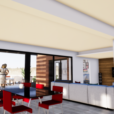 Sa maçonnerie en bloc de béton cellulaire doublée d’une isolation intérieure, le tout chauffée par une pack aérothermie (air/eau) couplé à un plancher chauffant font que cette maison répond à une étude thermique basse consommation.