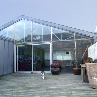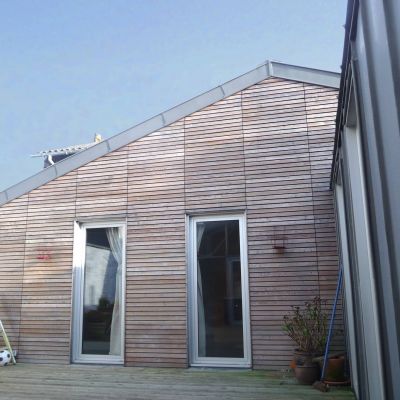 Les matériaux utilisées en façades du patio sont le zinc à joint debout, un bardage bois à claire voie et le verre.